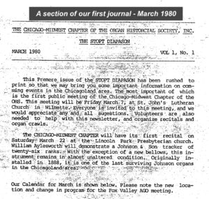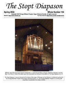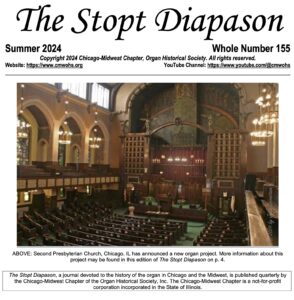 From issue Vol. 1 No.1 of March 1980 through the most recent issue Whole Number 155 of Summer 2024, The Stopt Diapason has presented research, history, specifications, photographs and news of interest about area pipe organs; it has documented past and future chapter activities and presented calendars of upcoming area organ recitals. The TSD has been a resource not only for Chicago-Midwest Chapter members, but also for the national headquarters of the Organ Historical Society, for other OHS local chapters, and for non-members interested in historical pipe organs, as well.