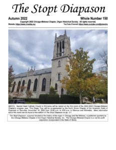Whole Number 150 – Autumn 2022 – A preview of the fall Combined Organ Tour, cosponsored by CMWOHS and the North Shore AGO chapter – includes photos and stoplists for the four organs on the tour. Also includes news from area organ builders, a calendar of chapter and area events for 2022-2023, and more.